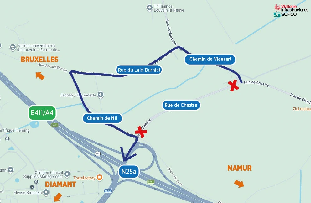 Les usagers venant de Corroy-le-Grand seront redirigés via le chemin de Vieusart, la rue du Laid Burniat et le chemin de Nil pour rejoindre l’échangeur.